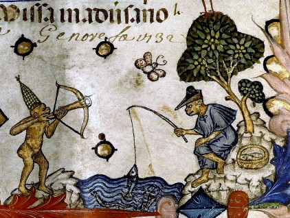 "Scimmie intente nella caccia e nella pesca", miniatura tratta dal 'Pontifical de Guillaume Durand' (prima del 1390), Bibliothèque Sainte-Geneviève, Parigi.