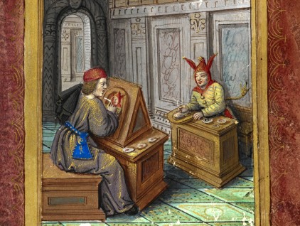 "Un pittore dipinge il ritratto di un giullare, che a sua volta ritrae il pittore", miniatura tratta dal 'Petit Livre d'Amour' di Pierre Sala (primo quarto del XVI secolo), British Library, Londra.