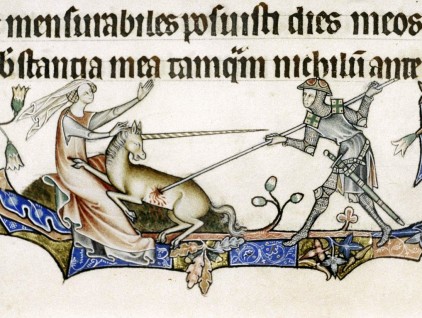 "Cavaliere che uccide unicorno", miniatura tratta dal 'Salterio Ormesby' (fine XIII secolo-inizi XIV secolo), Bodleian Library, Oxford.