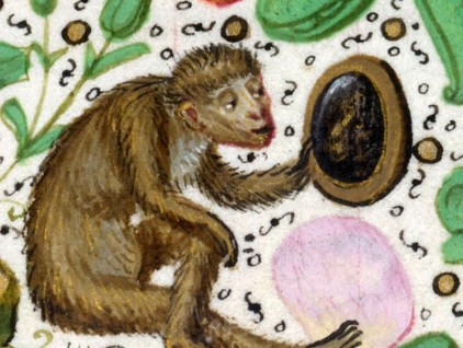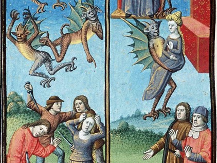 "Demoni cattivi (a sinistra) e demoni buoni (a destra)", miniatura tratta da 'La Cité de Dieu' (1475-1480), Koninklijke Bibliotheek, L'Aia.