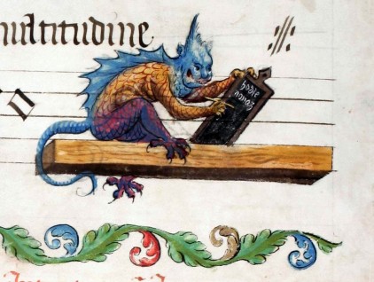 "Diavolo che scrive sulla lavagnetta le parole Hodie nonam", miniatura tratta da 'Canti a quattro voci per le principali festività dell'anno liturgico' (1562), Biblioteca dell'Abbazia di San Gallo, Svizzera.