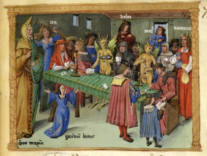 Miniatura tratta da 'Dialogue à deux personnages par lequel un homme apprend a vivre seurement' (Amboise, 1505), Bibliothèque nationale de France, Parigi. Sulla sinistra, sorvegliato dall'Ira, un cardinale gioca a carte con un re, mentre…