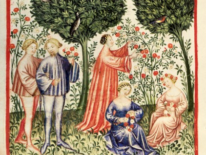 "Primavera", miniatura tratta da 'Theatrum Sanitatis' (Lombardia, XIV secolo), Biblioteca Casanatense, Roma.