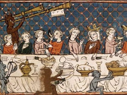 "I demoni del peccato di gola animano il banchetto", miniatura tratta dal 'Breviari d'Amor' (primo quarto del XIV secolo), British Library, Londra.