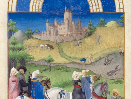 “Mese di agosto”, miniatura tratta dalle ‘Très Riches Heures del Duca di Berry’ (XV secolo), Musée Condé, Castello di Chantilly. Giovani signori e dame a cavallo vanno a caccia di selvaggina presso i corsi d’acqua,…
