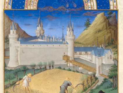 “Mese di luglio”, miniatura tratta dalle ‘Très Riches Heures del Duca di Berry’ (XV secolo), Musée Condé, Castello di Chantilly. I contadini mietono con la falce il grano disseminato di papaveri e fiordalisi, mentre un…