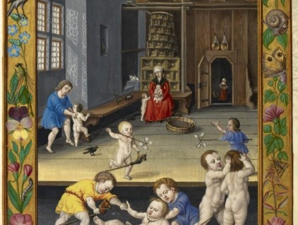 "Bambini che giocano", miniatura tratta dal codice 'Splendor Solis' (1582), British Library, Londra.