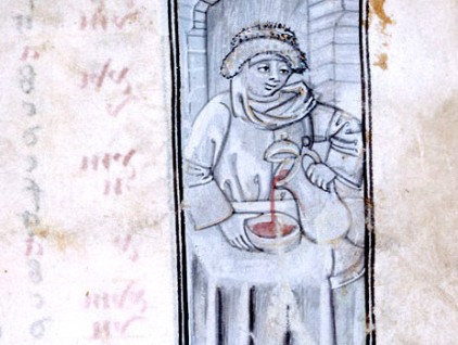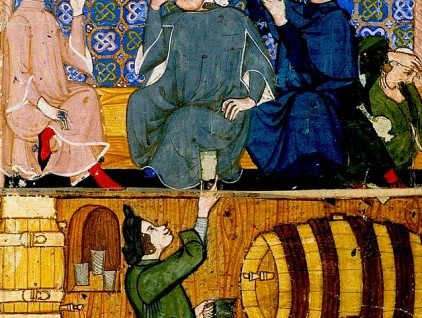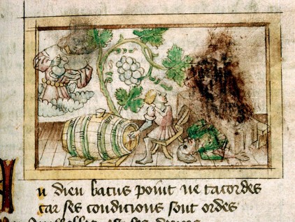 "Bacco si serve da bere; un uomo estrae il vino dalla botte-vigna; un altro uomo giace sbronzo sotto il tavolo", miniatura tratta da 'L'Epitre d'Othea di Christine de Pizan' (1460 circa), Bibliothèque municipale, Lille.