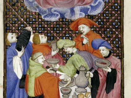 Miniatura raffigurante "Bacco e i suoi seguaci", tratta dalla raccolta 'Il libro della Regina' (1410-1414 circa), British Library, Londra.