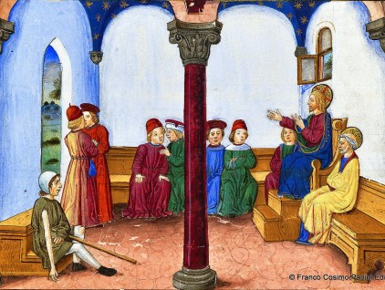 Nella sinagoga, i Farisei osservano se Cristo curerà di sabato: e infatti, sotto il loro sguardo scandalizzato... . ... Gesù guarisce la mano atrofizzata di un uomo, che esulta di gratitudine. Miniature tratte dal 'Leggendario…