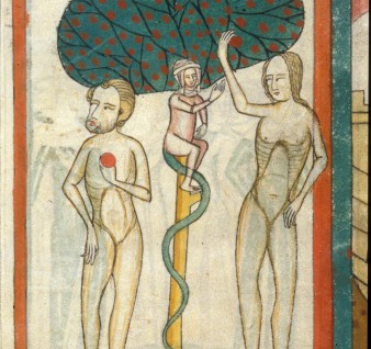 Adamo ed Eva, da Omne Bonum (Absolucio-Circumcisio), di James le Palmer, England, S. E. (London), c. 1360-c. 1375, MS Royal 6 E VI Adam and Eve, from Omne Bonum (Absolucio-Circumcisio), by James le Palmer, England,…