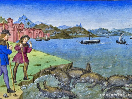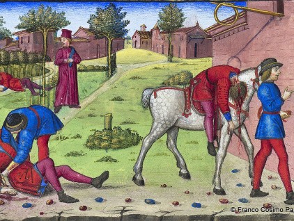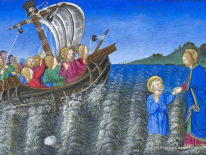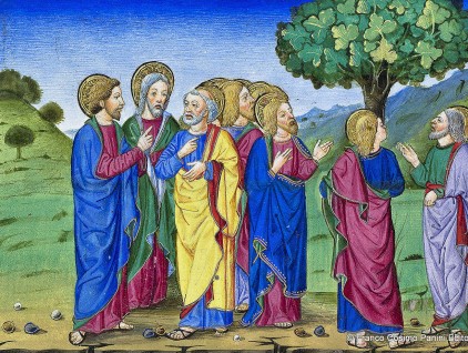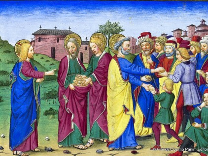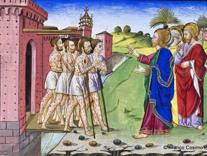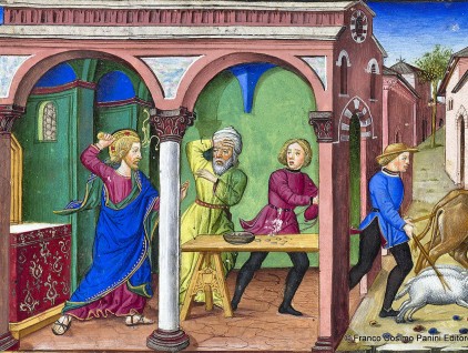 Un sabato, giorno di riposo, a pranzo da un fariseo Cristo guarisce un malato di idropisia, riconoscibile dal ventre gonfio per l’accumulazione di liquidi. Miniatura tratta dal 'Leggendario Sforza-Savoia' (Milano, 1476), Biblioteca Reale, Torino. Tutte…