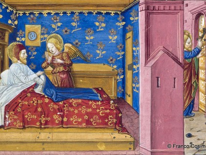 L’angelo annuncia a Gioacchino la nascita di Maria: Anna è incinta e il suo ventre inizia a ingrossare “al modo dela nostra naturale usanza”. Gioacchino si sta vestendo a letto perché un angelo apparsogli in sogno lo invita a…