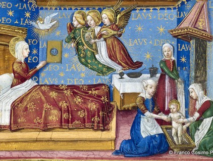 Maria nasce all’alba alla presenza del “divino Spirito Santo con ordinata compagnia de spiriti angelici con canti e melodie dulcissimi”. Le levatrici lavano la neonata e ne asciugano i panni al fuoco. Il verde, il bianco e il rosso…