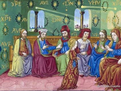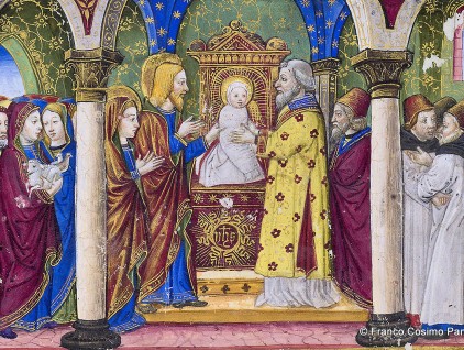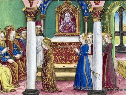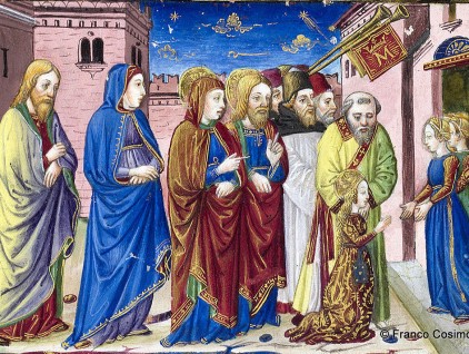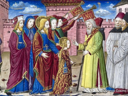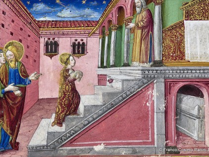 Maria condotta al Tempio: i sommi pontefici vengono incontro ai parenti che accompagnano Maria al Tempio “con ystrumenti e canti dilectissimi”. Miniatura tratta dal 'Leggendario Sforza-Savoia' (Milano, 1476), Biblioteca Reale, Torino.