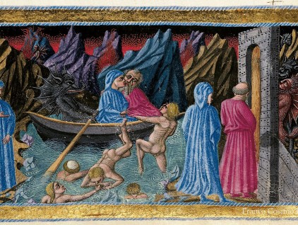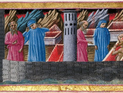 Inferno, Canto VIII. Dante e Virgilio giungono sulla riva della palude Stigia, che circonda la città di Dite. Sarà il demone Flegiàs che li traghetterà sull'altra sponda, come illustrato nella parte centrale della miniatura. Filippo…