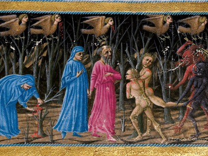 Inferno, Canto XIII. Un'atmosfera cupa e angosciante caratterizza la visita di Dante al bosco dei suicidi, le cui anime sono tramutate in piante divorate dalle mostruose arpie. Sulla sinistra è raffigurato il poeta subito dopo aver…
