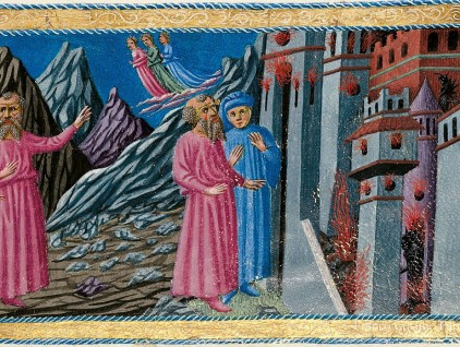 Inferno, Canto II. La miniatura è bipartita: a sinistra Virgilio spiega a Dante che il suo viaggio è reso possibile da "tre donne benedette" (Vergine Maria, santa Lucia e Beatrice, che vegliano dall'alto); a destra…