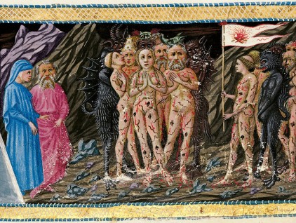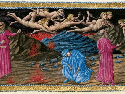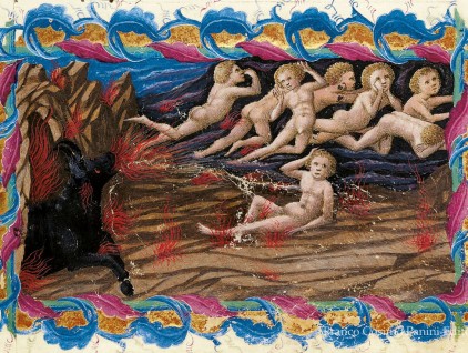 Inferno, Canto V. La miniatura - l'unica in tutto il manoscritto in cui non compaiono Dante e Virgilio - illustra la pena dei lussuriosi, i "peccator carnali" che hanno sottomesso la ragione all'istinto. Il toro…