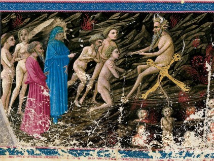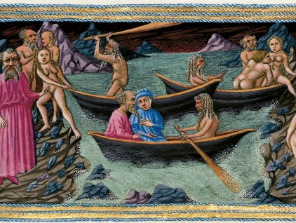 Inferno, Canto III. Protagonista della miniatura è Caronte, di cui sono fedelmente rappresentati gli "occhi di bragia" e le "lanose gote", anche se la sua nave si è trasformata in una barchetta munita di un…