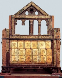 L'ipotesi sarebbe avallata dal fatto che le formelle d'avorio sono affisse su tavole di legno in modo da formare un dittico: esso avrebbe costituito la copertura esterna di un oggetto di particolare valore, due lastre d'argento lavorate a sbalzo e raffiguranti le planimetrie di Roma e di Costantinopoli, ricordate nel testamento di Carlo Magno come cosa a lui molto cara e lasciata in eredità alla basilica di San Pietro.