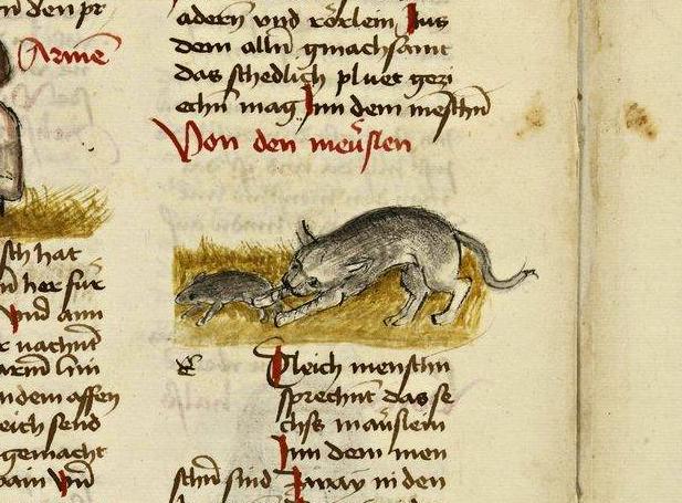 "Gatto cattura un topo", illustrazione tratta dall'opera 'Buch der natur' di Conrad de Megenberg (Germania, 1434), Bibliothèque nationale de France, Parigi.