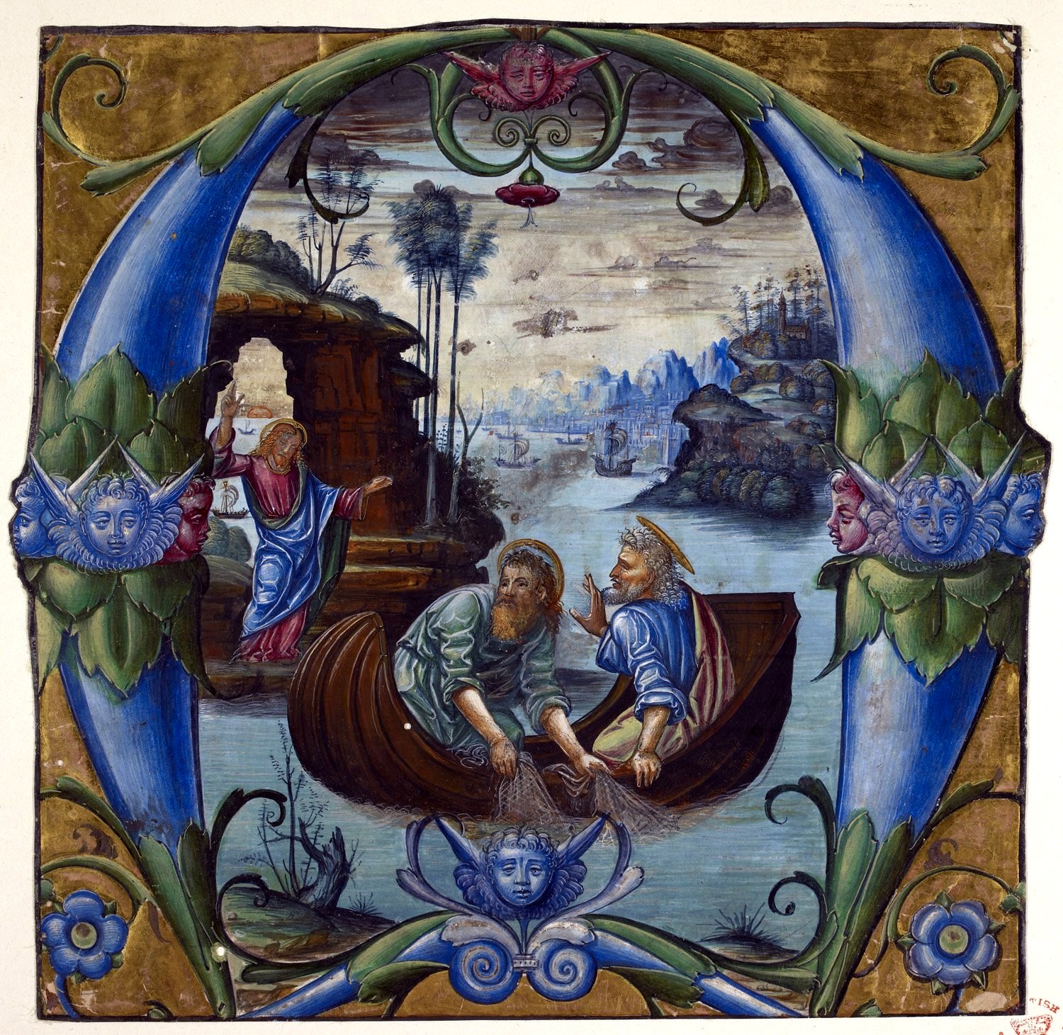 Iniziale "M" raffigurante "La vocazione di Pietro e Andrea", frammento tratto da Corale (inizi del XVI secolo), British Library. L'influenza di Leonardo da Vinci si riconosce nella resa del paesaggio sullo sfondo, e in particolare negli azzurri speroni rocciosi.