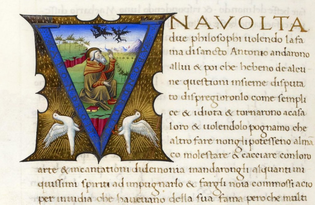 Iniziale figurata "U" ("Una volta due filosofi") tratta da 'Vite di santi padri' di Domenico Cavalca (Lombardia, XV secolo), Bibliothèque nationale de France, Parigi.