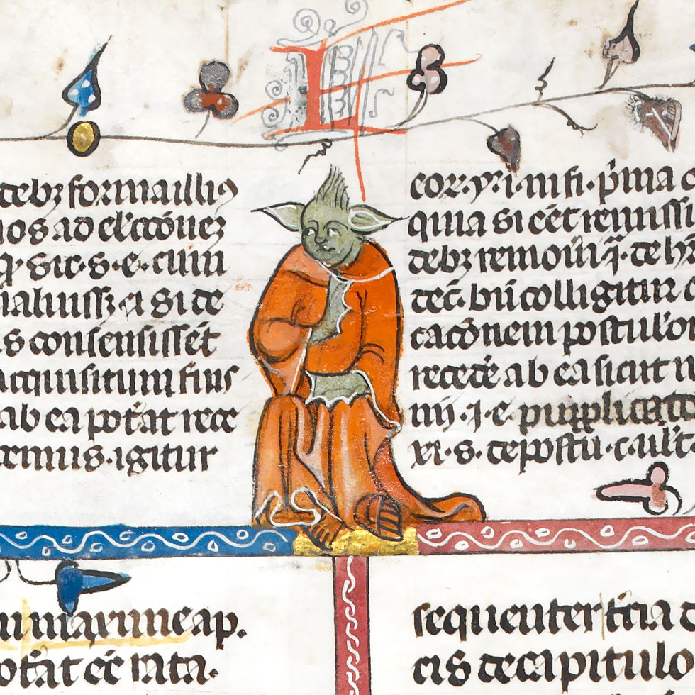 I fan potranno sicuramente notare un'incredibile somiglianza fra la creatura nella miniatura proposta e il Maestro Yoda... forse il vecchio Gran Maestro Jedi stava addestrando qualche giovane Padawan nella Londra del 1300, dove il manoscritto (di origini francesi) venne decorato?