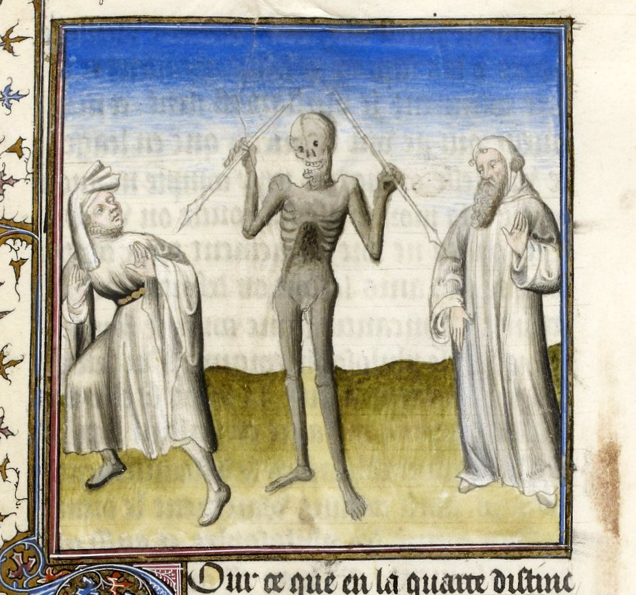 "La morte minaccia sia i giovani che gli anziani", miniatura tratta dal 'Livre de vieillesse' (traduzione in francese del 'De Senectute' di Cicerone, 1405-1410), Bibliothèque nationale de France, Parigi.