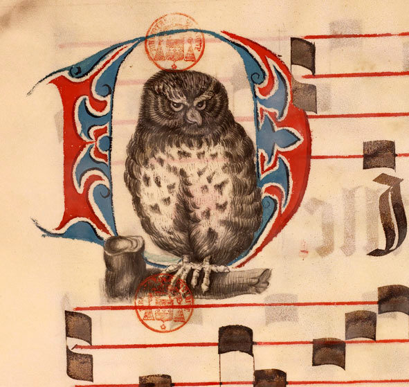 Iniziale "D" raffigurante una civetta, illustrazione tratta da Graduale (1549 - ultimato nel XVIII secolo), Bibliothèque Mazarine, Parigi.