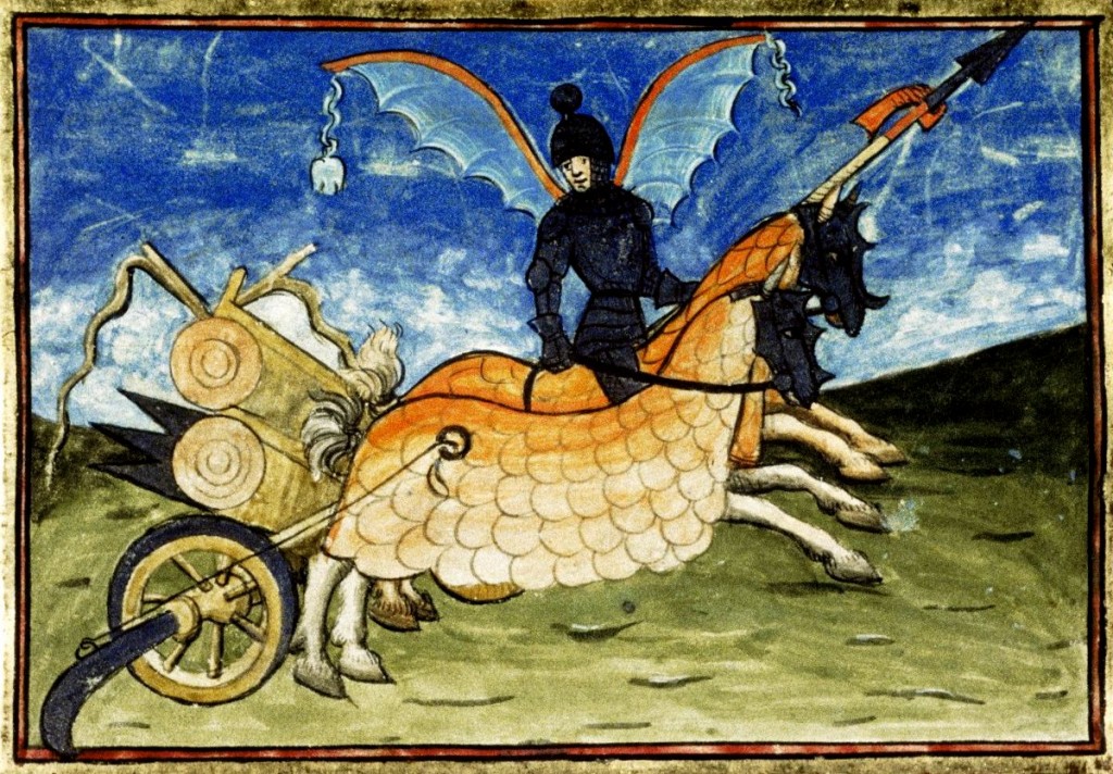 "Carro da combattimento", illustrazione tratta da 'Cosmographia Scoti' (Italia e Francia, 1476), Bodleian Library, Oxford.