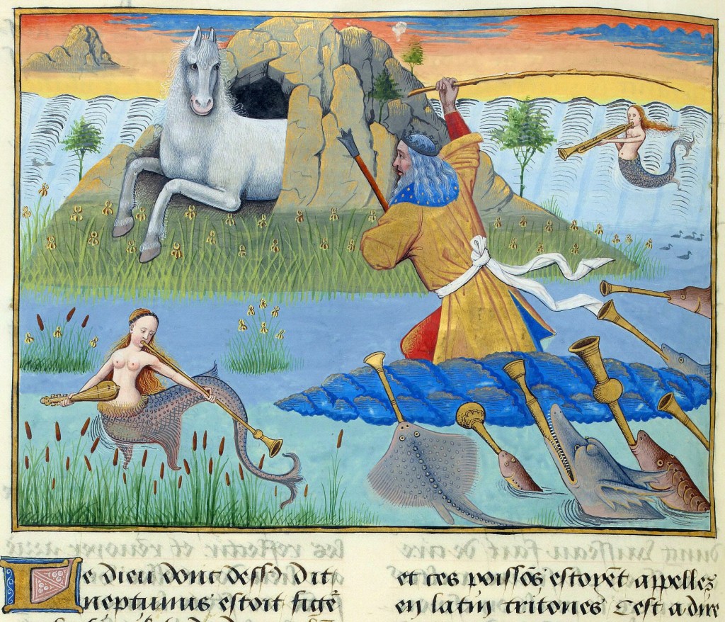 "Nettuno colpisce una roccia con il suo tridente trasformandola in un cavallo", miniatura tratta dal 'Livre des échecs amoureux moralisés' (XV secolo), Bibliothèque nationale de France, Parigi.