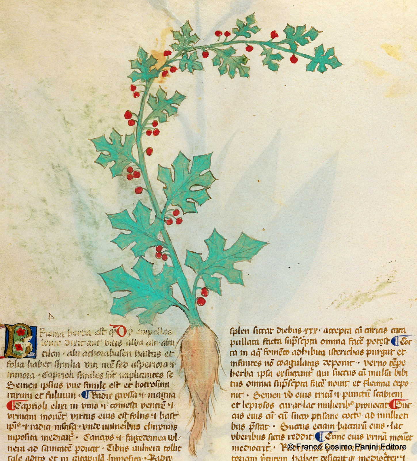 “La brionia è un’erba che, secondo Dioscoride, si chiama vite selvatica o vite bianca. I suoi germogli cotti nel vino e mangiati muovono il ventre e l’urina. La sua radice ridona il buon colorito al corpo; discrepa le rughe, elimina le lentiggini, ripristina il colore alle cicatrici profonde al posto del color paonazzo e cura pure le efelid. Chi la porta con sé, allontana ogni malasorte.”