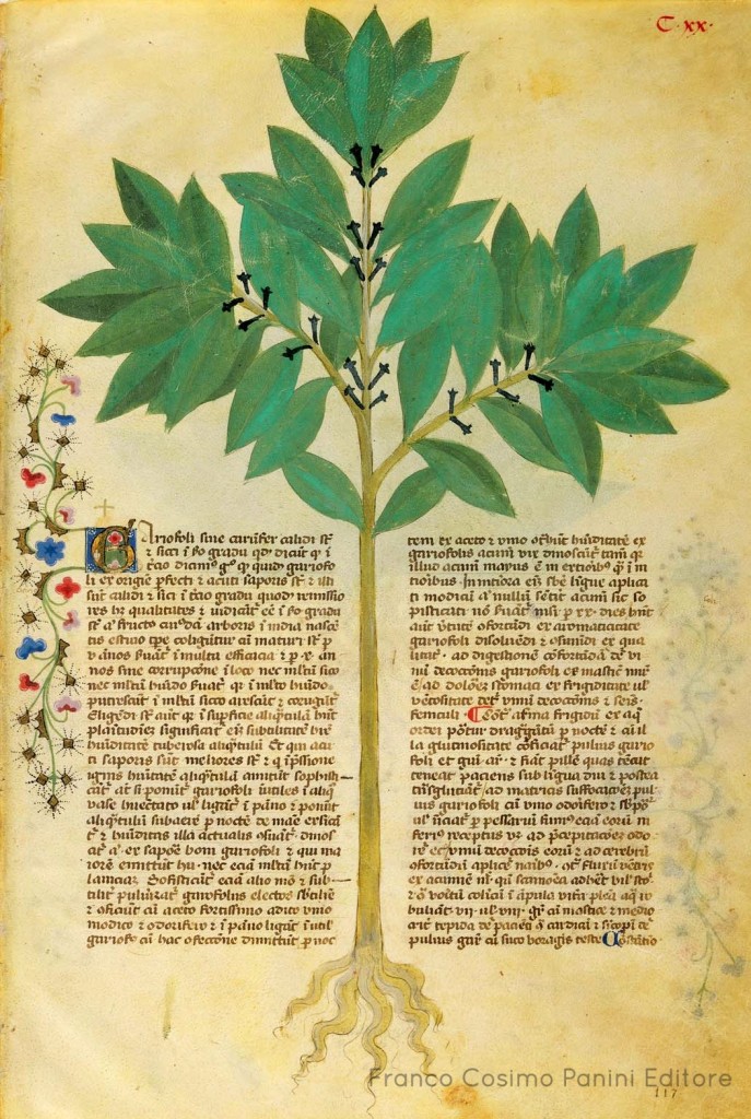 "I chiodi di garofano sono i frutti di un certo albero che nasce in India. Contro il dolore dello stomaco da infreddatura si dà il vino del loro decotto con i semi del finocchio. Per evitare di cadere e per confortare il cervello si applicano alle narici". Non conoscendo l’origine della spezia, il miniatore dipinge i boccioli dei fiori come già essiccati ma ancora attaccati alla pianta.