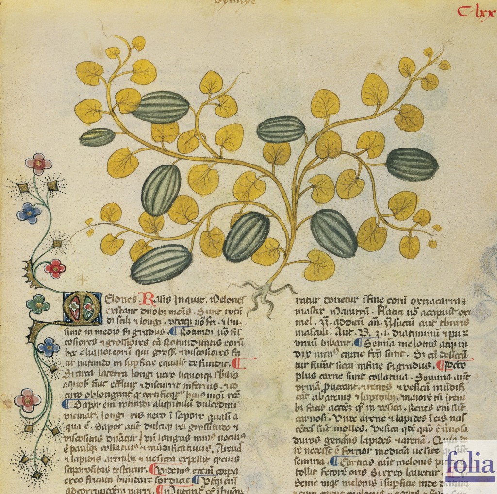"La capacità dei meloni è dimostrata: si è visto che sfregandoli sul corpo eliminano la sporcizia; leniscono i nervi e li rendono sciolti; scacciano dalla vescica i calcoli. Se capita di mangiarli prima di altri cibi, diventano nocivi nello stomaco, ma se restano sopra vengono digeriti dai commensali e vengono paragonati per virtù ai cibi buoni."