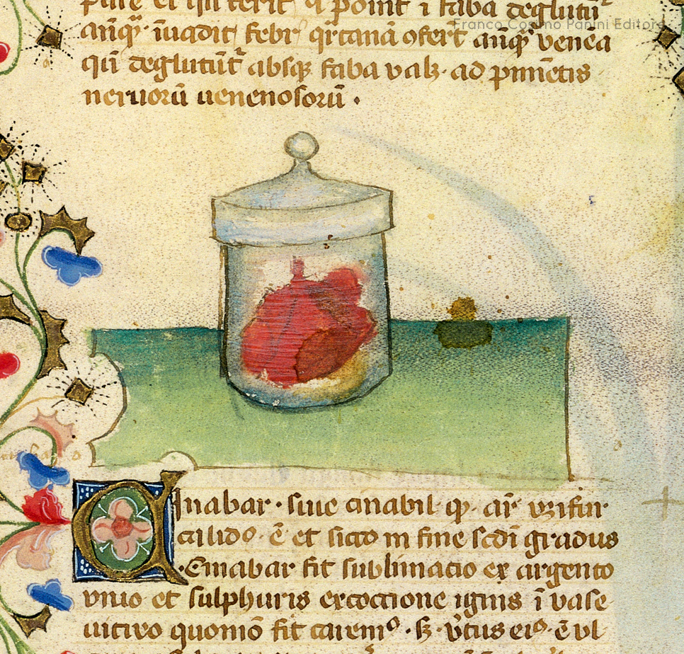 "Il cinabro ha il colore del sangue e per il suo colore intenso alcuni pensano che sia il sangue di drago. Si prepara facendo sublimare l’argento vivo e lo zolfo mediante la decozione sul fuoco in un vaso vetrificato. Viene utilmente in aiuto alle pustole e alle scottature."