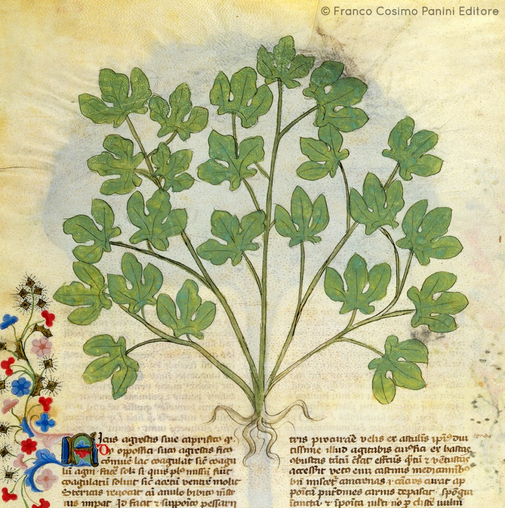 "Il fico agreste ha molte virtù: giova alla rogna, cura la vitiligine, toglie la morfea bianca, cura la scabbia e mondifica la pelle. Calma il dolore dei denti e viene in soccorso al morso degli animali velenosi e del cane rabbioso."