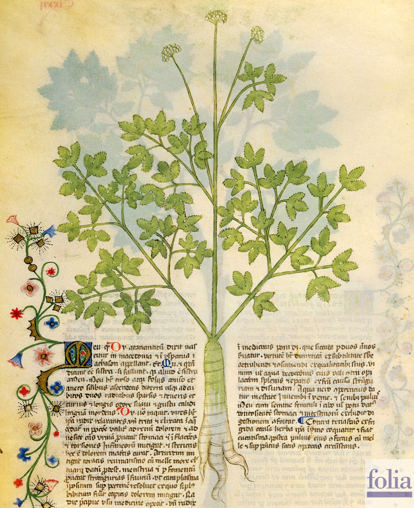 “La pozione di radice di meo ha proprietà rilassanti, provoca l’urina, cura la vulva, lenisce il gonfiore di stomaco e lo storcimento dell’intestino, mitiga l’artritismo, giova al catarro del torace, risolve la stranguria dei giovani. Infine, elimina il mal di testa.”