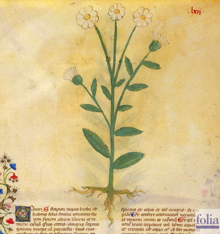 “Il partenio ha odore grave e sapore amaro. Quando viene odorato il suo vapore, favorisce il sonno ma non ne induce troppo. Il suo olio è risolutivo, calefattivo e sottigliativo.”