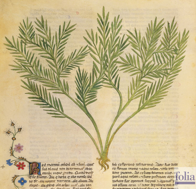 “Il rosmarino è un’erba che cresce principalmente nei luoghi martini, donde si dice ros marino. Le foglie e i fiori, raccolti ed essiccati al sole, si possono conservare per un anno, e hanno la virtù di confortare per l’aroma.”