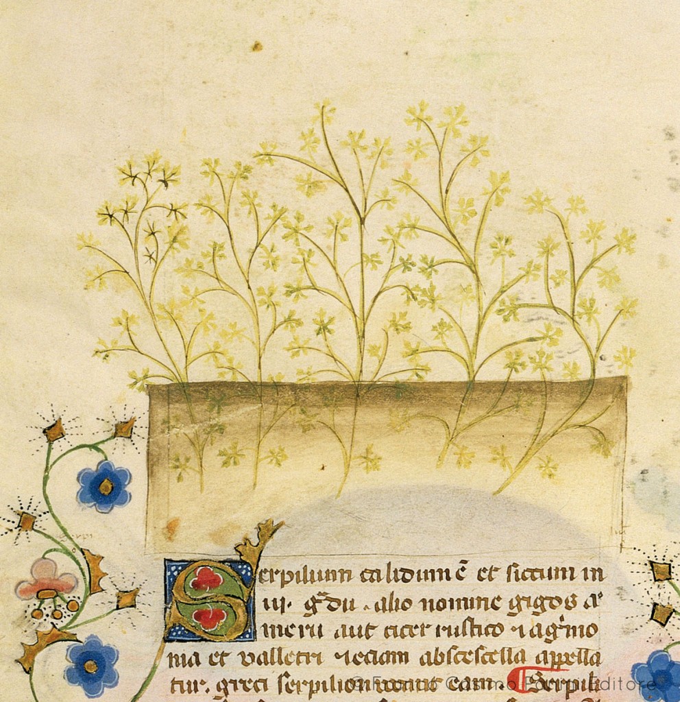 "Il serpillo è chiamato così perché distende i suoi rami sulla terra. Le sue foglie, riscaldate e poste in un sacchetto applicato sul capo, giovano contro il catarro da infreddatura, mentre il vino della sua decozione unito all'anice viene in aiuto contro il dolore di stomaco per ventosità."