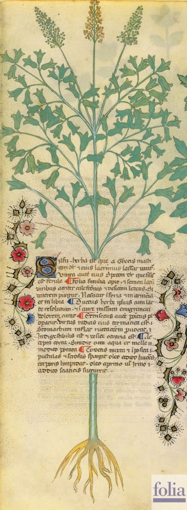 “Il succo del silfio, sciolto nel latte e messo nell’orecchio, cura il dolore dell’emicrania. Aggiunto l’olio chiarifica i lividi del corpo e soccorre i sofferenti di sciatica.”