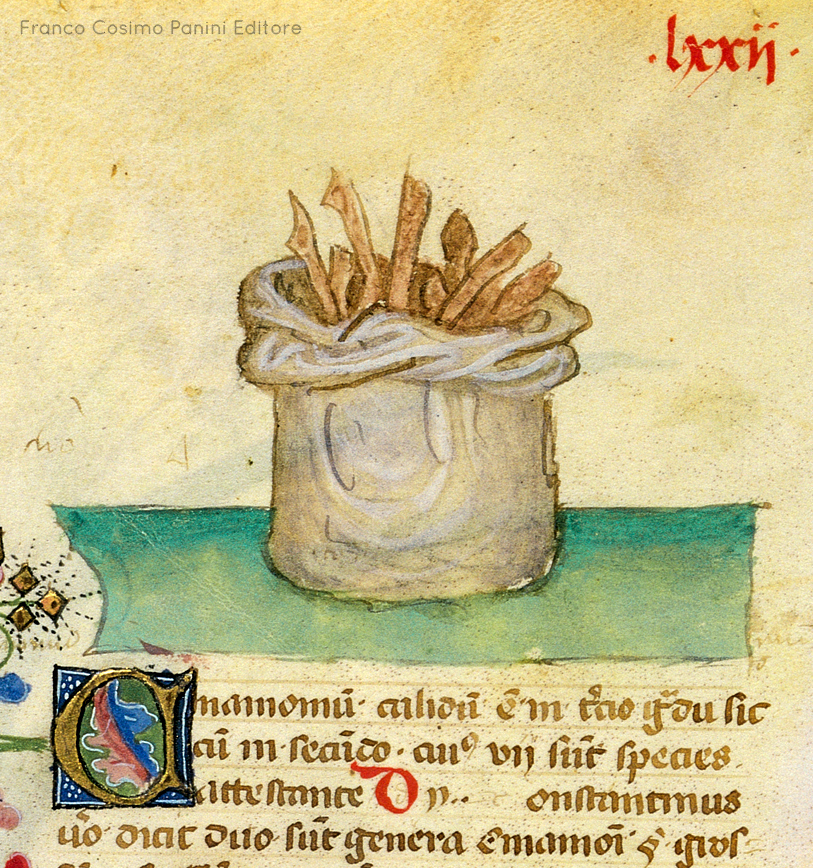 "Il cinnamomo gode della virtù di confortare il cervello. È utile per le ferite recenti delle labbra. Contro i disturbi cardiaci si dà la sua polvere con la polvere di chiodi di garofano."