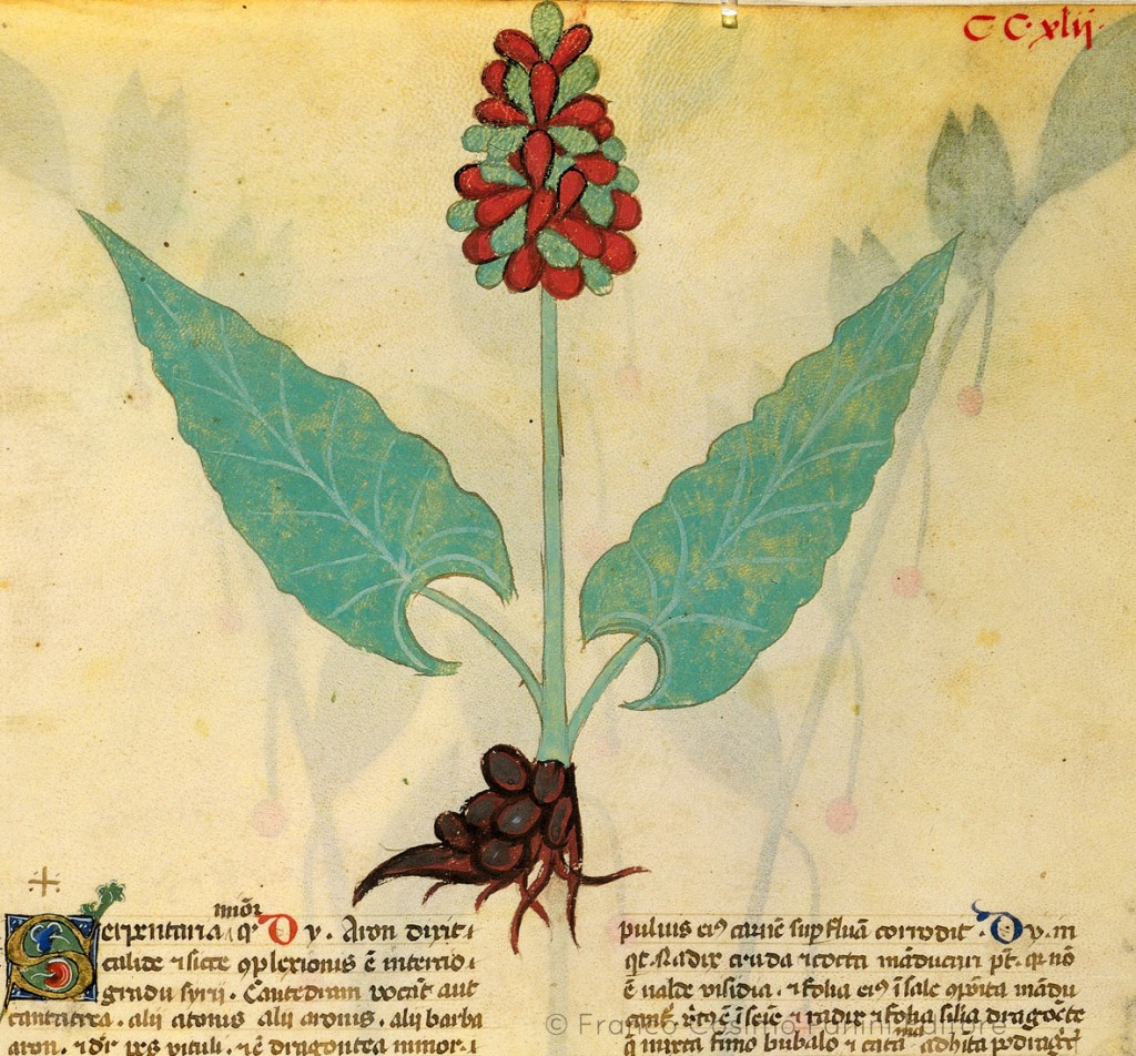 "La serpentaria minore nasce nei luoghi umidi, ombrosi e sui cigli dei fossi. Per depurare la faccia e assottigliare la pelle si prepara la polvere sottile con le tuberosità essiccate, si confeziona con l'acqua rosata, si pone al sole per far consumare l'acqua, si fa per tre o quattro volte o più. Con sola questa polvere si lenisce infine il volto."