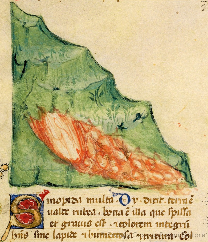 "La sinopia è una terra rossa che si raccoglie in Cappadocia.Viene in aiuto a chi soffre di catarro e, presa con un uovo, trattiene il ventre e soccorre chi soffre per aver bevuto il veleno. È anche utile a chi soffre di febbre forte per cui molti la chiamano terra dei carpentieri".