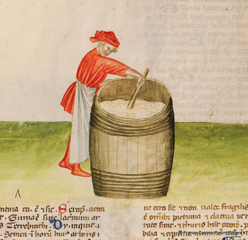 "La trementina è il succo dell'albero terebinto e gode di molte virtù. Elimina il prurito sulle parti recondite, arresta i disturbi del torace, fissa i peli degli occhi e, con l'aggiunta della ruggine delle campane, purga la rogna del corpo". La preparazione della trementina era ottenuta attraverso un processo di distillazione: si deve pertanto concludere che la trementina raffigurata nella botte sia già pronta per l'uso nel suo aspetto semi-liquido.