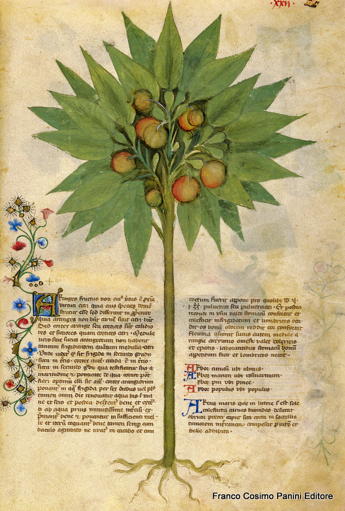 "I frutti dell'arancio sono conosciuti e hanno numerose virtù: rinforzano validamente lo stomaco, riscaldano il raffreddato e uccidono i vermi lombricoidi. Danno un buon odore alla bocca, confortano il cuore e dissipano la flemma. Il loro succo, bevuto a digiuno, giova al colerico e all'epatico".