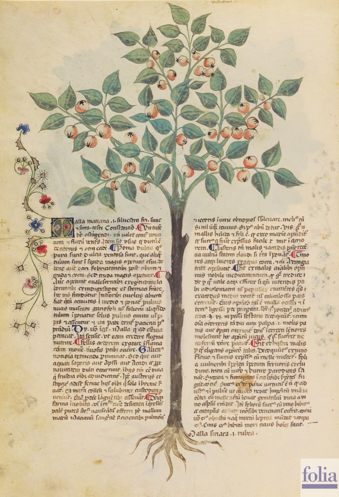 “Le mele silvestri sono utili per i sofferenti di indigestione e di imbarazzo di stomaco. Avvolte nella farina, incartate ed essiccate sotto la cenere giovano a chi soffre di nausea e a chi sputa sangue dai polmoni. Si danno non a digiuno, ma dopo il pasto.”