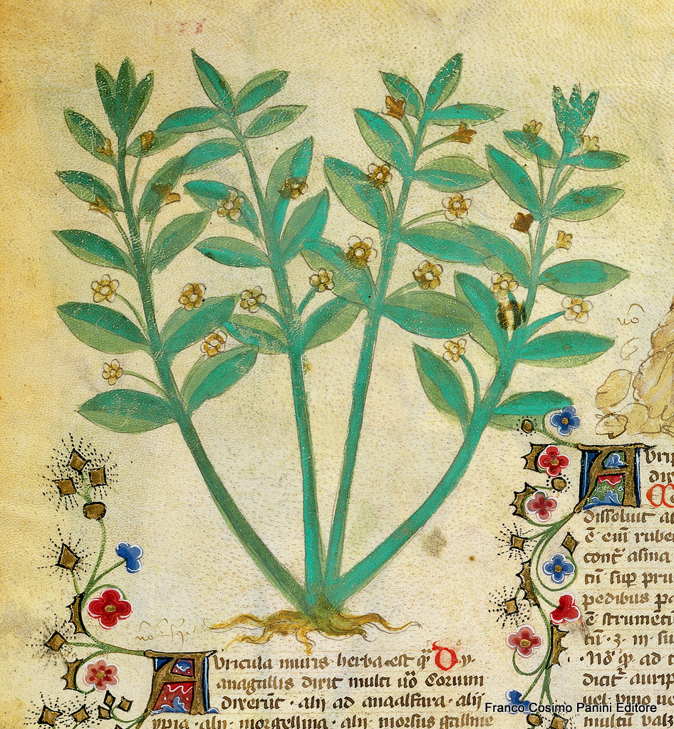 "L'orecchio di topo è un'erba chiamata anche anagallide. Il suo succo è utile contro il dolore dei denti. Se manca un dente nella parte destra della bocca, si instilla il succo nella parte sinistra del naso".  Dal codice “Historia Plantarum”, fine XIV secolo → https://bit.ly/HistoriaPlantarum